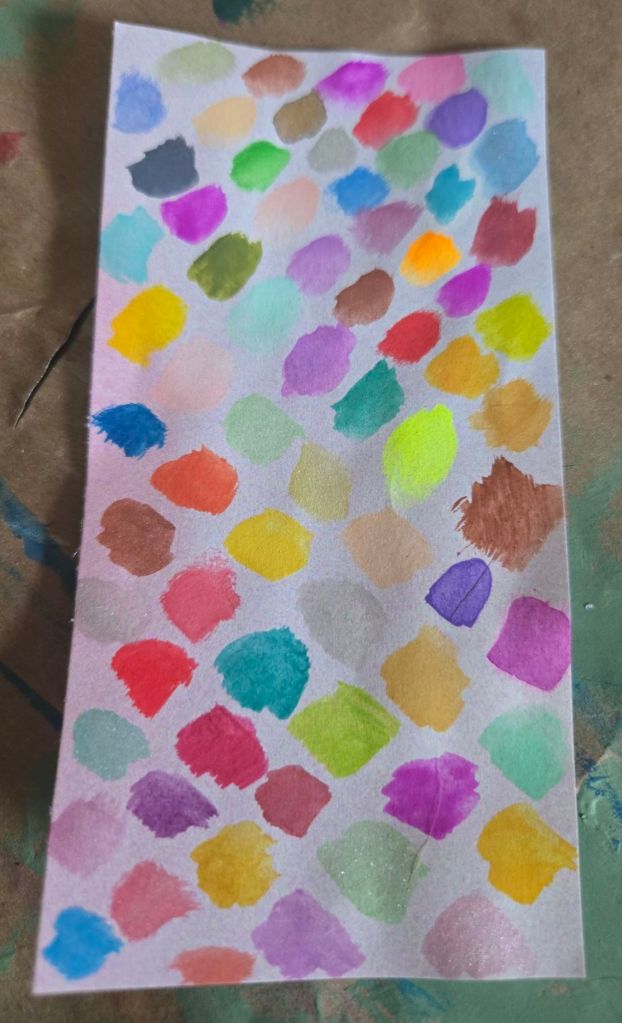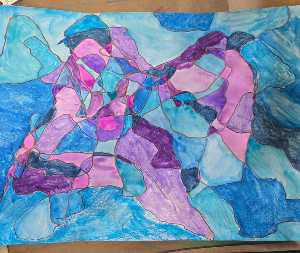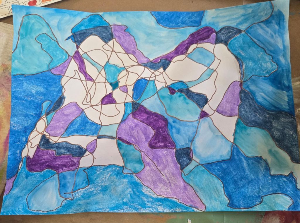 Here are 2 pieces made with watercolors. The first is just a sampling of colors. The second was a doodle drawn by using a copper Pen-Touch pen to follow a pebble around the paper. Then, I used watercolors in blues and purples to fill it in.