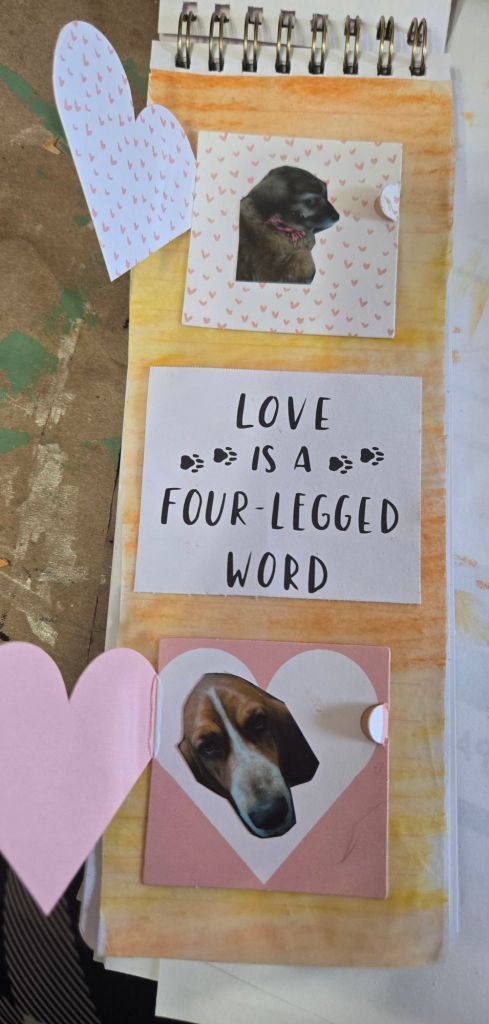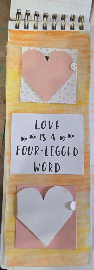 Today’s project was a page in a tall skinny notebook. I used a piece of translucent paper and colored it with oil pastels, then smudged them together. I glued that down. Then I had some little cards with heart doors on them, so I added those. I found an appointment card from my vet that said love is a four-legged word and thought that was a good addition. I cut it down and glued it on. Then, I printed tiny pictures of two of my dogs and glued those inside the heart doors. I am pleased with the result.