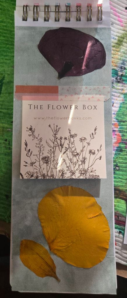 This morning, I put together a little page of some of my flower petals collection. Along with a business card from my local florist. A poppy petal that turned very dark after pressing it. It started out bright red. I can not remember where the two yellow petals came from. Most likely from a wonderful bouquet made by those local florists. Uses a piece of mottled green paper for the background. Hope you enjoy this one.