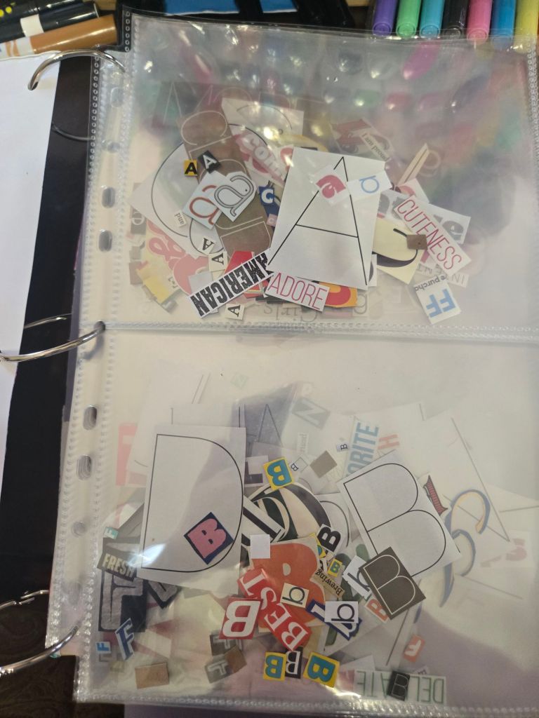 I made a 3 ring binder out of a scrap paper collage cereal box for the front and the back. Then, I purchased some plastic photo sleeves to put my words and individual letters along with shapes I have been cutting out. The only problem is if it got tipped upside-down, some of the pieces would fall out. Otherwise, it is working great for me.