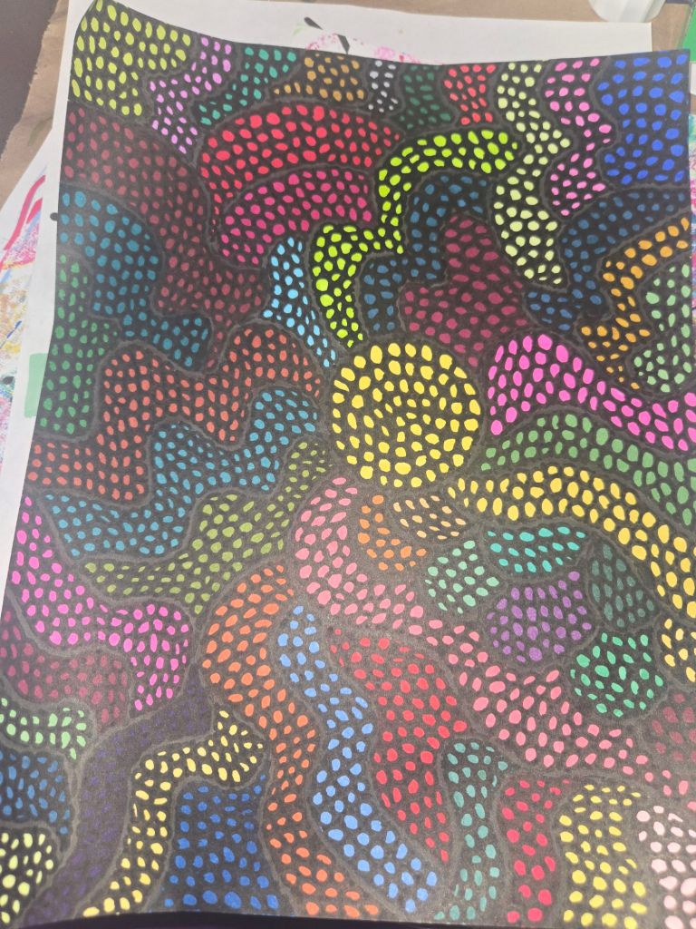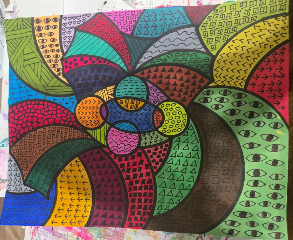 I have been trying out some more detailed work lately. I am using an ultra fine point black marker to create the doodles. In this one, I used a variety of different shapes and patterns. In the picture below, I made circles and darkened the space around them.