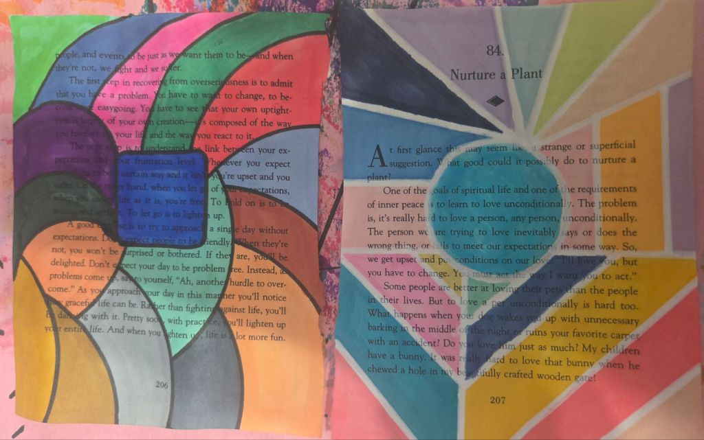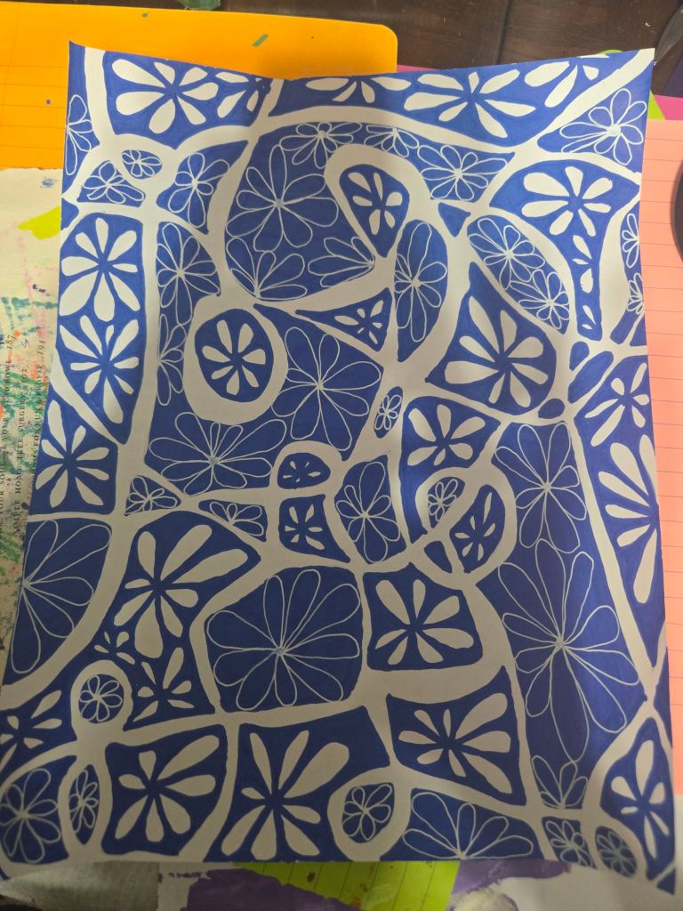 I traced around a piece of string that I spread out on my paper to start this one. Then I used a blue acrylic paint pen and colored in some of the open spots and made flower designs in the rest of them. Then, I used a white gel pen to make the white flowers over the blue areas. I have done this in black and white, but I really like how it turned out using blue instead.